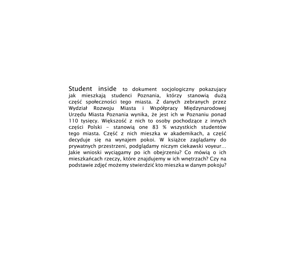 is a sociological document showing how Poznań students, who make up a large part of the city’s community, live. According to data collected by the City Development and International Cooperation Department of the Poznań City Hall, there are more than 110,000 of them in Poznań. Most of them are from other parts of Poland – they account for 83% of all students in this city. Some of them live in dormitories, while others choose to rent rooms. The book takes a peek into private spaces, peeping in like a curious voyeur…. What conclusions do we draw after seeing it? What do the things we find in their spaces say about their owners? Can we tell from the photos who lives in a specific room?